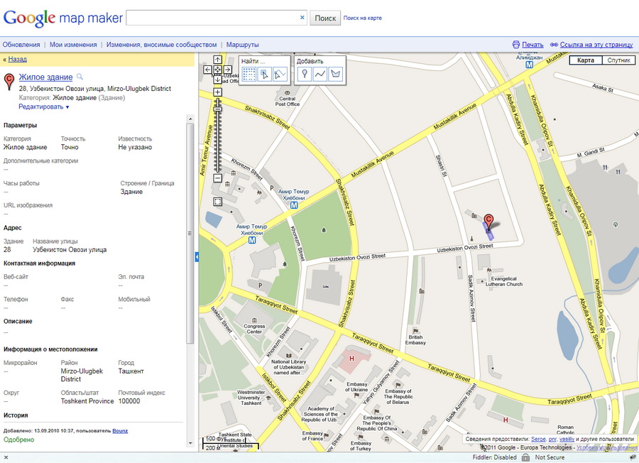 В Google Map Maker все объекты также создаются их двух примитивов: точки и линии. В отличии от OSM, где редактор сам проставляет атрибуты объектам и их значения, в GMM количество возможных атрибутов ограничено, равно как и их значения. Это облегчает описательную часть работы. В GMM действует система модераторов и одобрений. Ваш объект появится на карте только после достаточного количества одобрений со стороны других пользователей. После одобрения объект рендерится в обычные карты Google и его можно увидеть на всех сервисах, использующих Google Maps.